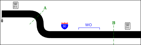 However, if you add 6 miles to the roadway starting at either point A or point B, the roadway data will not be accurate. For example, if you add 6 miles at point A, Infor Operations and Regulations will add that length to the measurement of the interstate sign, giving a new measurement of 14.5 miles from the start. In reality, that sign is no longer attached to the roadway.
