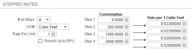You can set the unit of measure and the rate per unit for the steps. In the example above, Cubic Feet is selected in the UOM list and 1 is entered in the Rate Per Unit field, so the rate fields are labeled Rate per 1 Cubic Feet. If you entered 100 in the Rate Per Unit field, you would then be setting rates per 100 cubic feet.