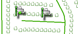 To load database records you must first activate the associated map features. To perform actions on those records, such as adding a service request for an address, the markers that represent them must also be selected. Selected markers are identified by green dots, such as the address marker on the left below.