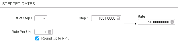 You can set the unit of measure and the rate per unit for the steps. In the example above, Cubic Feet is selected in the UOM list and 1 is entered in the Rate Per Unit field, so the rate fields are labeled Rate per 1 Cubic Feet. If you entered 100 in the Rate Per Unit field, you would then be setting rates per 100 cubic feet.