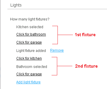 In the setup for this field, How many light fixtures? is the prompt question and Add light fixture is the field's increment link text (the text that the CSR clicks to add a light fixture). The post increment text, Light fixture added, is displayed above each light fixture that the CSR adds. The decrement link text, Remove, is used to remove a light fixture.