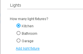 The example shows a quantity field that counts light fixtures, with three items: Kitchen, Bathroom, and Garage. For each light fixture the CSR adds, the script shows a link for each item. By clicking on the appropriate link, the CSR indicates the type of light fixture. So the screenshot shows two light fixtures, one in the bathroom and one in the kitchen.
