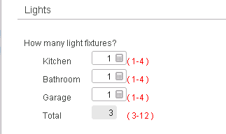 In addition, each quantity field contains one or more quantity items that break down the count into different types. For example, a quantity field that counts light fixtures might include items for the number of fixtures in the kitchen, in the bathrooms, in the garage, and so on. To add items, use the grid. You can specify a default quantity, a minimum, and a maximum for the quantity field and for each item. The items represent subtotals of the overall quantity, so the minimum for the quantity field must be equal to or greater than the sum of the minimum quantities for all items.
