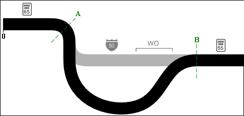 However, if you add 6 miles to the roadway starting at either point A or point B, the roadway data will not be accurate. For example, if you add 6 miles at point A, Infor Operations and Regulations will add that length to the measurement of the interstate sign, giving a new measurement of 14.5 miles from the start. In reality, that sign is no longer attached to the roadway.