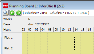 The time span is modified and indicated on the left, when the batches are dragged. If you select a point in the planning board (not a batch) and drag, the information bar displays the selected time span on the left, and the time covered by the selection on the right. Therefore, the intervals between batches can be measured.