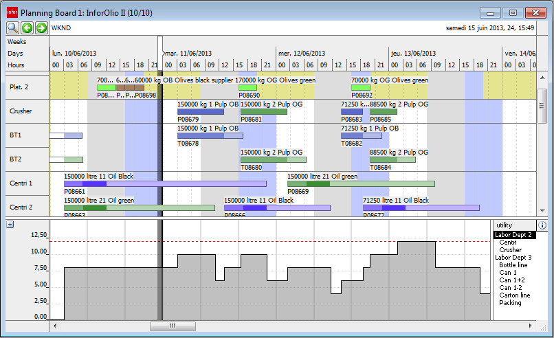 The utility requirements simulation is a graphical representation of the utilities for production. The production is based on the scheduled batches, the utility requirements, shift times, and the number of workers required to operate the resources defined in the time period. If you cannot view this graph in the planning board, the graph is not included in the view definition.