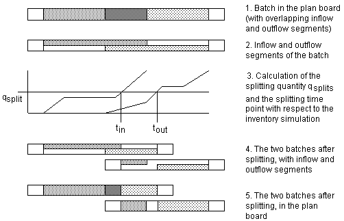 Inflow and outflow must not occur simultaneously or at the same rate. Additionally, for an incomplete scheduled batch, the inflow quantity is smaller than the outflow quantity. When splitting, both the inflow and outflow is split in the same way as the new batches require inflow and outflow.