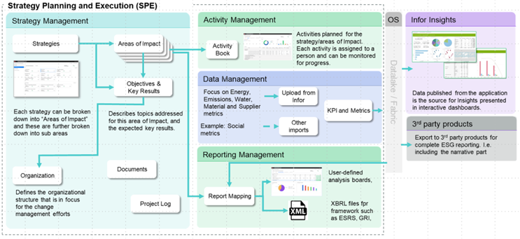 SPE is included in the CloudSuite Core bundles for M3- and LN-based CloudSuites. It supports defining strategies, objectives, key results, and activities to monitor actions assigned to activity owners and the target owners of Key Performance Indicators (KPIs).