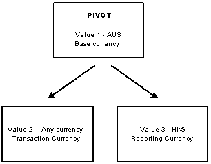 Take an example of an Australian subsidiary of a Hong Kong company. The base currency is Australian dollars and the reporting currency is Hong Kong dollars. The base currency also acts as the pivot currency.