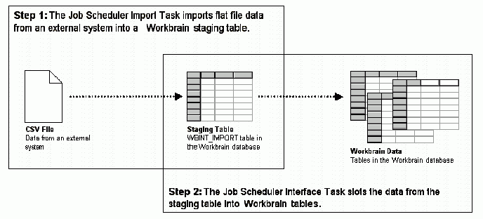 - The import task imports the data from an external text file into a staging table (WBINT_IMPORT).