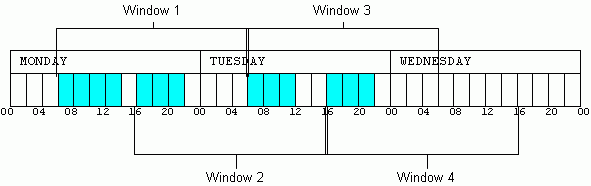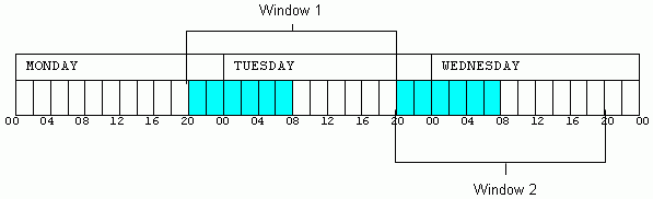 Schedule compliance returns two violations, one violation for each window. Window 1 violates because 14 hours (Monday 8:00 PM to Tuesday 8:00 AM, plus Tuesday 6:00 PM to 8:00 PM), are worked in the first 24 hour window. Window 2 violates because 14 hours (Tuesday 6:00 PM to Wednesday 8:00 AM) are worked in the second 24 hour window.