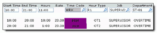 | 10 | PRM | OT1 | Premium time and a half overtime rate at $15 an hour | $150 |