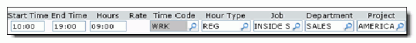 In this example result, the employee is scheduled to work 10:00 to 18:00 Monday to Friday. The employee works in the SALES department and records his work against the INSIDE SALES job and the AMERICAS project.
