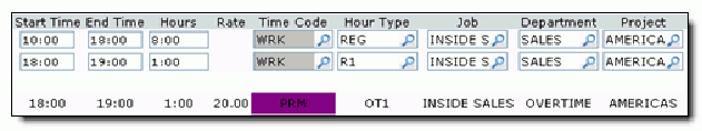 | 1 | PRM | OT1 | Premium time and a half overtime rate at $15 an hour | $15 |