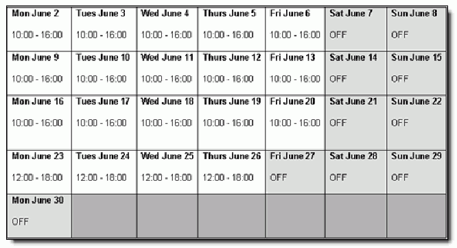 In this example result, the employee’s regular shifts are 6 hours (360 minutes in the REGSHIFT UDF) in duration. During the month of June, the employee is scheduled from 10:00 to 16:00 in the CLERK job for 15 shifts and 4 shifts from 12:00 to 18:00.