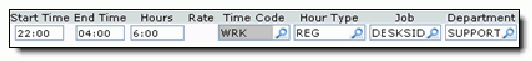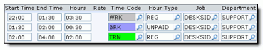 In this example result, the employee is scheduled to work the OVERNIGHT shift. The employee records working from 22:00 to 1:30, taking a 30 minute break, and receiving training from 2:00 to 4:00.