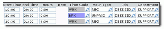 In this example result, the employee is scheduled to work the OVERNIGHT shift. The employee records working from 20:00 to 1:30, taking a 30 minute break, and working from 2:00 to 4:00.