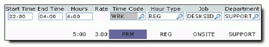 The employee earns a 5 hour premium, paid at $3 (25% his 12.00 base rate), charged against his default labor allocation, the ONSITE job and SUPPORT department.