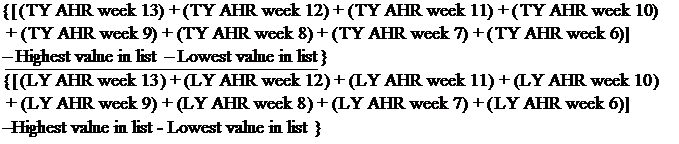 For example, the application uses the following formula to calculate the AHR trend for week 14, where LY means “last year” and TY means “this year”: