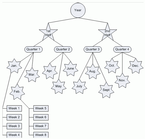Time periods in Labor Budgeting are hierarchical. The initial level of granularity is one week. By default, each year is divided into quarters, months and weeks. Each quarter has three months, and each month has either four or five weeks.