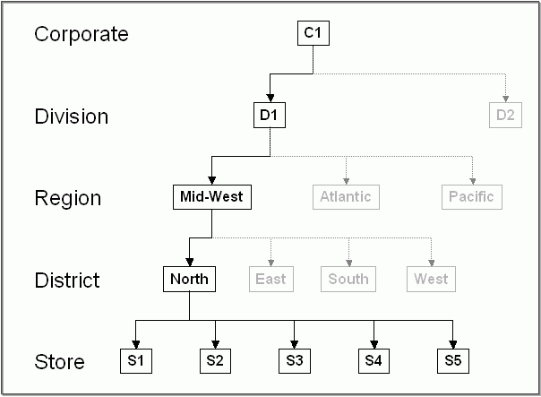 The root budget manager can view and release the Worksheet within that hierarchy only. For example, the D1 district budget manager cannot release the forecast to any location that is not under that location in the hierarchy, such as the C1 corporate budget manager, who is above that level, or the D2 district budget manager, who is at the same level.