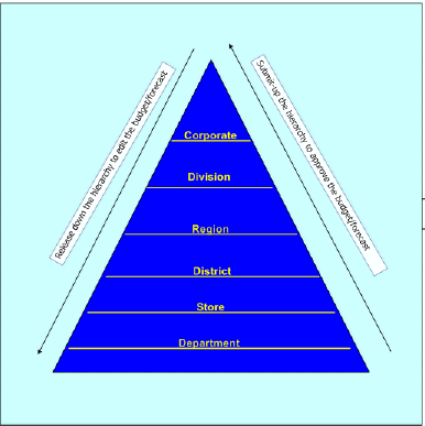 - The root budget manager releases the budget/forecast. The budget/forecast flows down the hierarchy, level-by-level, from the corporate level to the lowest level, such as the Store level.