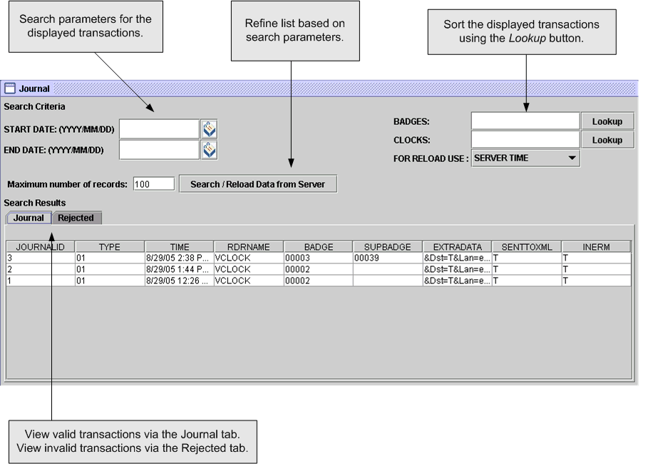 You can search for and sort all the clock punches the WBCS has received with the Journal page of the Admin console. The Journal page has two tabs: the Journal tab lists the valid or accepted clock punches and the Rejected tab lists the punches that were rejected by the WBCS.