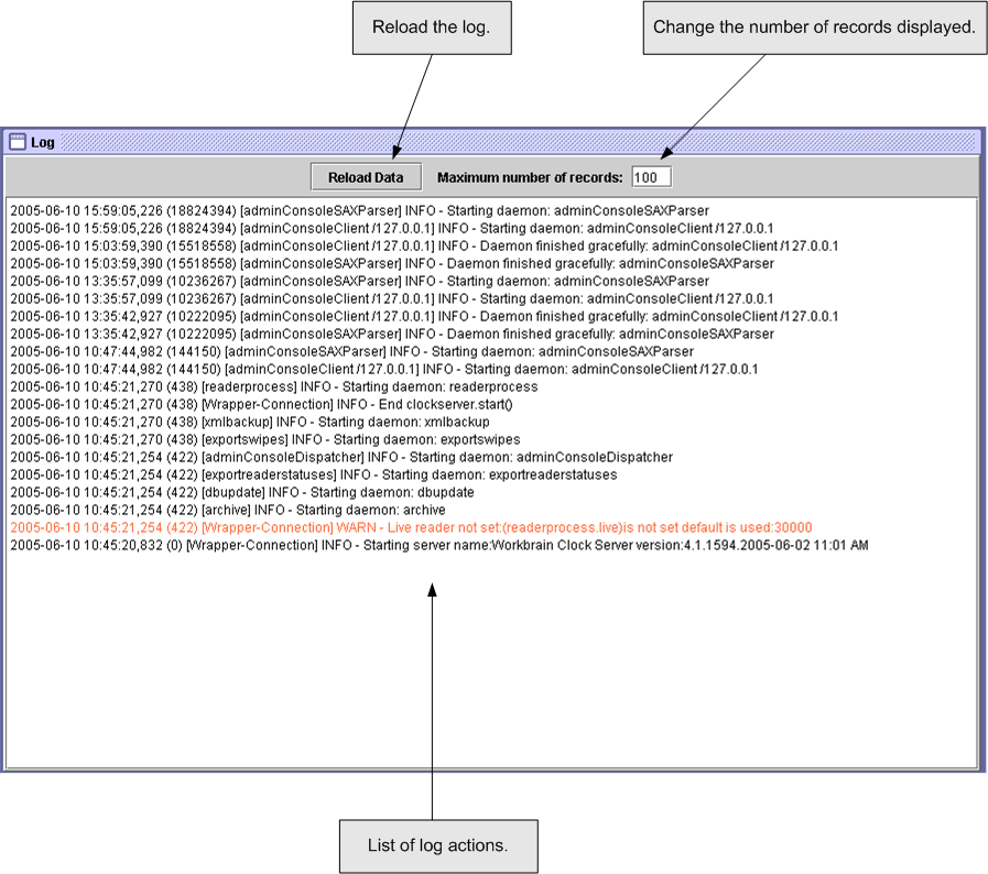You can view the WBCS log messages using the Log page. The Log page can be configured to display different levels of messages. For more information on log settings, refer to Modifying log file settings using Admin Console.