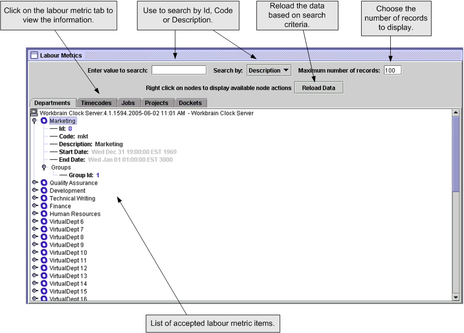 - Click on the labor metric tab to display the corresponding information. You can view available departments, time codes, jobs, projects, or dockets. Each tab displays information based on: