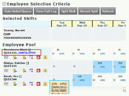 Employee skills are displayed in the employee header of the employee pool in the Relief Calling Area. Names of the skills associated to the employees are displayed after the employee number (EMP_NAME field).