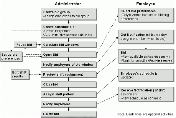 The scheduled bidding workflow has two user groups: administrators and employees. This diagram provides an overview of the bidding interaction process: