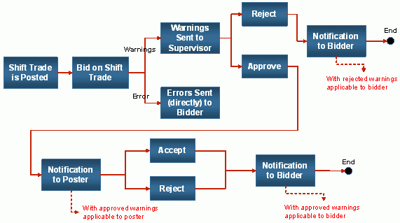- Shift trades that result in warning violations from Schedule Compliance are sent to the supervisor for approval. The supervisor can choose to approve all warnings or reject the trade.