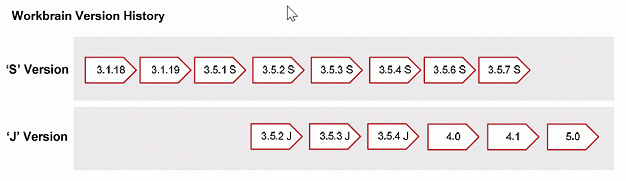 Workbrain provided new releases both tracks simultaneously for a short period of time as indicated above. The last release for the ‘S’ version of the product was Version 3.5.7 S. All subsequent development (Version 4.0 and higher) has been on the ‘J’ version.