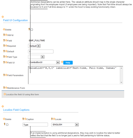 Clients and implementation teams should update the localization for the EMP_FULLTIME drop-down. The localization should include mappings for the valid status options that are relevant to their particular implementation. For example, this screen shows a definition for the Casual status: