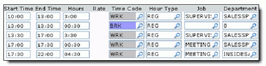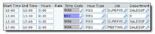 In this example result, the employee is scheduled to work for 7 hours, from 10:00 to 17:00. The employee takes a half hour break at 13:00 and stays late, from 17:00 to 19:00, to attend a departmental meeting.