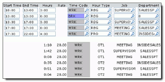 In this example result, the employee is scheduled to work for 7 hours, from 10:00 to 17:00. The employee takes a half hour break at 13:00 and stays late, from 17:00 to 22:00, to attend two meetings, one in the SALESSPT department and one in the INSIDESALES department.