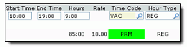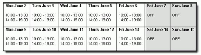 In this example result, the employee is scheduled to work Monday to Friday, from 10:00 to 19:00 each day, with an hour break at 13:00. The pay period starts June 2nd and ends June 15th.