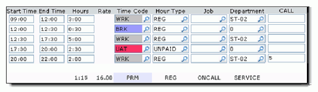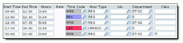 In this example result, the employee works their regular 8-hour day from 9:00 to 17:00, with an hour lunch. In the evening, the employee responds to 5 calls and spends an additional 2 hours working to resolve the calls. The employee records 5 in the CALL field.