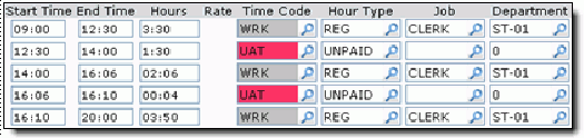 The employee’s timesheet has 3.5 hours of work, followed by 45 minutes with the UAT time code, and another 4 hours and 45 minutes of work.