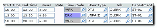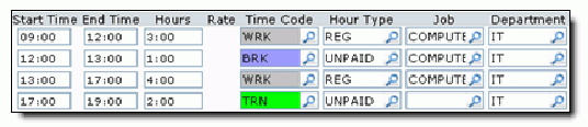 In this example result, the employee works on a special project from 9:00 to 21:00 on Tuesday, Wednesday, and Thursday. The employee is paid double-time as incentive to work on the project.