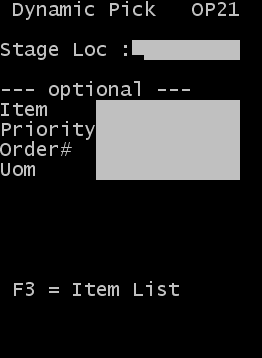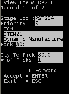 - Repeat the above process to complete all picks within the search or press Esc to return to screen OP21 and change the search criteria.