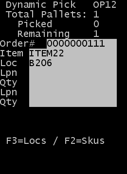 Note: The screen that displays above has been configured to allow 1 or 2 pallets to be picked simultaneously. As previously noted, the screen can be configured to record up to three pallet picks on one screen.