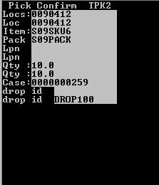 The application sends you the first pick task. The Pick (TPK) screen is displayed.