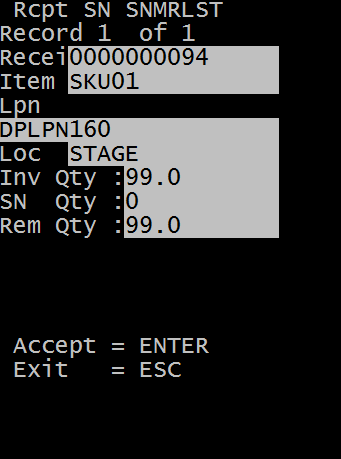 Drücken Sie auf die Eingabetaste, um nach einer Liste mit zu korrigierenden Wareneingangsdatensätzen zu suchen. Daraufhin wird die Maske WE-ID (SNMRLST) angezeigt.