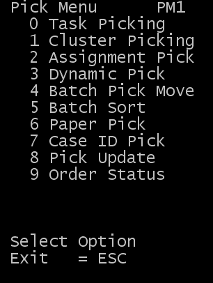 Wählen Sie im Hauptmenü des RF-Geräts Kommissionieren aus. Die Maske Menü Kommiss (PM1) wird angezeigt.
