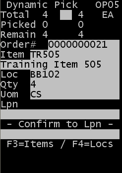 Drücken Sie die Eingabetaste. Die Maske Dyn. Kommiss. (OP05) wird angezeigt, um eine Palettenteilmenge (weniger als eine volle Palette) zu kommissionieren.