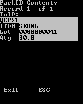 Wählen Sie auf der Maske Verpack. (P4) die Option aus. Auf der Maske VerpID Inhalt wird die verpackte Menge für den Artikel angezeigt.