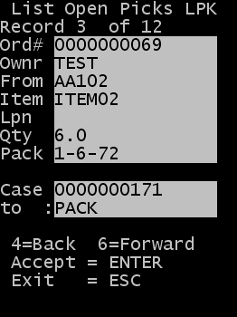 Jede verfügbare Kommissionierung wird auf einer eigenen Seite angezeigt. Die Gesamtzahl der Kommissionierungsdatensätze wird im oberen Bereich der Ergebnismaske angezeigt. Mit der Taste 6 können Sie einen Bildlauf vorwärts durch die Liste der Datensätze ausführen, mit 4 rückwärts. Mit Esc verlassen Sie die Liste, ohne eine Kommissionierung zu beginnen.