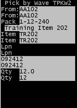 HinweisSie können RF-Kommissionierungsstrategien auf der Workstation konfigurieren, um für drei der oben aufgeführten Felder zu steuern, welche Eingabe vom Bearbeiter verlangt wird: Artikel, Von Lizenzplakettennummer (LPN) und Von Lagerplatz.