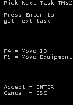 Die Maske Nchst Aufg Kom (TM52) wird angezeigt, damit Sie entweder die restlichen offenen Kommissionierungen anzeigen, durch Drücken der Eingabetaste eine neue Aufgabe anfordern oder den kommissionierten Artikel auf einen anderen Lagerplatz umlagern können.